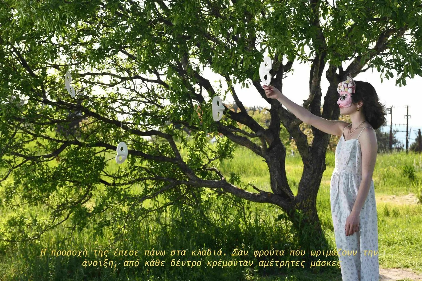 Ξαφνικά η ατμόσφαιρα γύρω της γέμισε και με άλλες φωνές καθώς όλο και περισσότερες μάσκες ξεκίνησαν να ζωντανεύουν. Η μία μετά την άλλη, σε δέντρα κοντινά και σε δέντρα μακρινά, γυρνούσαν προς το μέρος της και προσέφεραν λόγια γνώριμα, με φωνές οικείες.